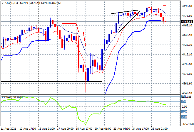 Wall Street fell back even harder of the hawkish Fed commentary with the NASDAQ down 0.6% while the S&P500 finished 0.5% lower at 4470 points. The four hourly chart is perhaps showing a delayed bearish rising wedge pattern as the key 4500 point target has turned into resistance as sentiment inverts. A true dip could be underway if we close the week out substantially below four hourly ATR support here: