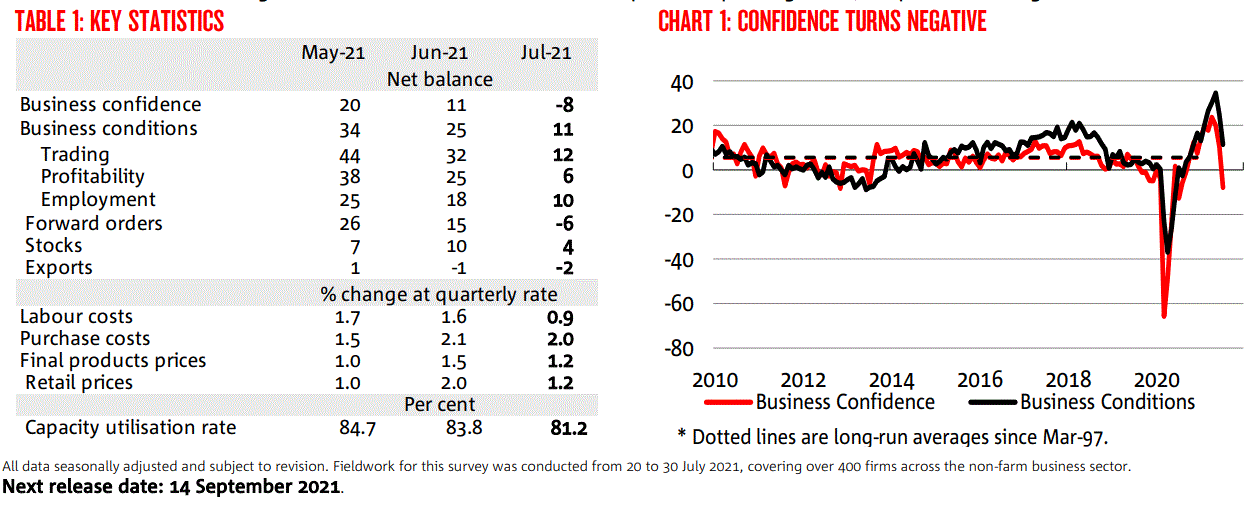 The survey continues to show widespread impacts of lockdowns. Both conditions and confidence deteriorated sharply in the month, with the latter now back in negative territory. Unsurprisingly, due to its size and the severity of the lockdown in the state, NSW drove much of the result this month. Both confidence and conditions fell sharply following a full month of lockdown in the state. That said, conditions fell in all mainland states, with SA in particular also seeing a very large fall. Conditions softened in all industries, with the exception of mining – where it remains elevated. The forward-looking indicators also softened and, with forward orders now back in negative territory and capacity utilisation now back around average, suggest little improvement in conditions in the near term. Overall, the survey shows that the strength in the business sector seen in early-to-mid 2021 has faded on the back of fresh disruptions in the economy but it has not yet deteriorated to the lows seen in early 2020. With the survey showing a very strong momentum in the leadup to the recent lockdowns, the hope is that once restrictions are eased, the economy will rebound relatively quickly, consistent with the experience through the pandemic to date, and resume a strong growth trajectory – and a return to strong capex and employment plans.