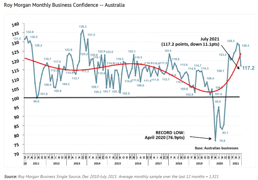 Roy Morgan has released its business confidence survey for July, which plunged by 11.1 points (-8.7%) to 117.2 after Sydney, Melbourne and Adelaide were placed in lockdowns:
