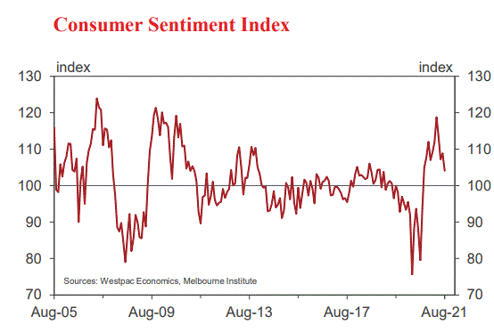 The prolonged ‘delta lock-down’ continues to take its toll on the NSW consumer mood. The extended, intensified and widened restrictions took a further 4.1% of confidence in NSW, the state index now down 14.8% from its May high but still in slight positive territory overall at 101.