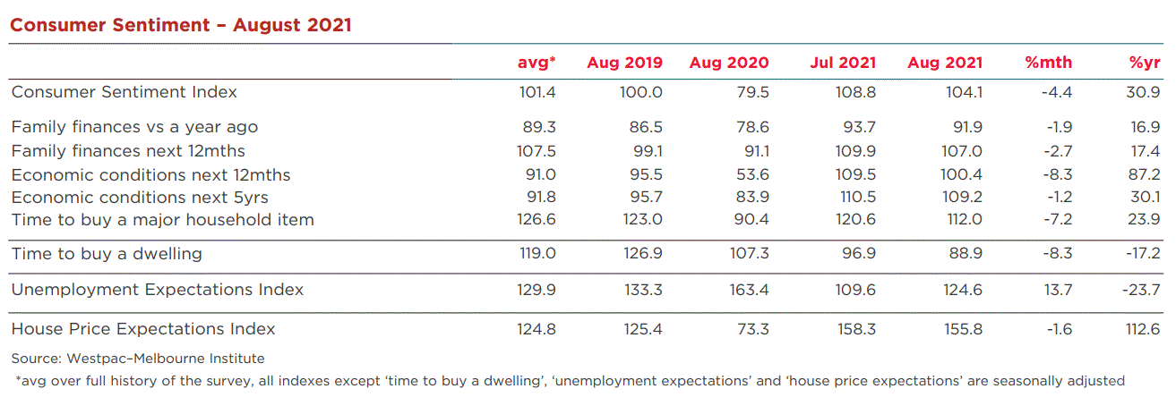 At 104.1, the Index is now at its lowest point in a year but still well above the deeply negative lows seen during last year’s national lock-down (75.6) and Victoria’s ‘second wave’ restrictions (79.5). Remarkably, the Index is also comfortably above the readings seen over the twelve months prior to the pandemic (an average read of 97.5). The virus situation locally is clearly troubling, but consumers appear reasonably confident that it will come back under control, and that once it does, the economy will see a return to robust growth.