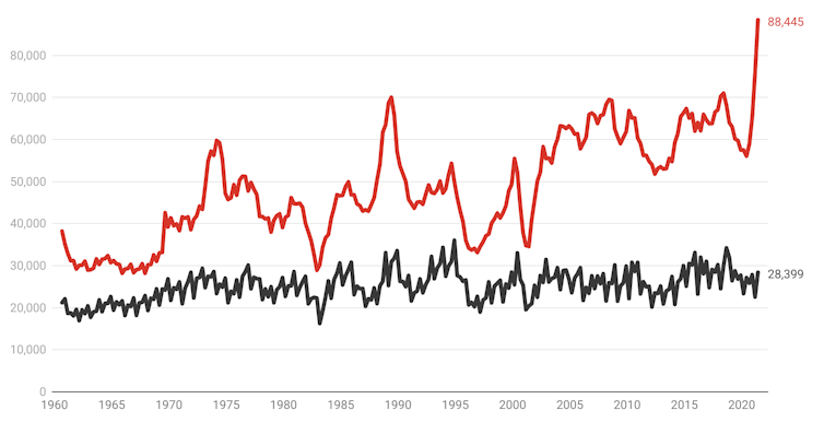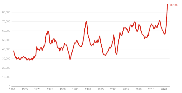 Over the space of a year the number of houses (not apartments) under construction has jumped from 56,060 in the June quarter 2020 to 88,445 in the June quarter 2021 — the biggest peak of all time.