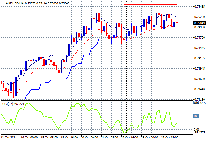 Australian stocks have followed the crowd with the ASX200 falling 0.2% to finish at 7430 points while the Australian dollar continues to float listlessly here right on the 75 handle, with last week’s high turning into firmer resistance:
