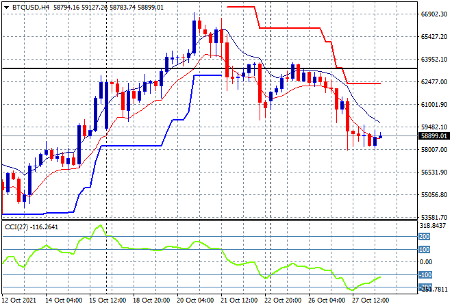 Asian stock markets are all lower on poorer risk sentiment as concerns about inflation stemming from last night’s Bank of Canada move and stirring bond markets continue to grow. This is spilling over into sour sentiment for Eureopan and US stocks heading into the London open, while the USD is remaining relatively strong against the major currency pairs. Gold is trying again after traders lost hope, just pipping over the $1800USD per ounce level, while Bitcoin is desperately trying to find a bottom here after getting dumped overnight, currently hovering just below the $59K level as it proves completely unable to burst back above the previous and record high: