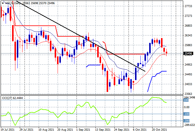 Looking at share markets in Asia from yesterday’s session, where Chinese shares again moved sharply lower with the Shanghai Composite pushed more than 1% lower, closing at 3512 points while the Hang Seng Index tried to hold on to a scratch session result, but fell back nearly 0.3% to close at 25555 points. Price action is showing a rollover is imminent, as the solid level of resistance at the key 26000 points level at the previous September highs remains out of reach. The daily chart is suggesting a follow through on this rollover is possible, so watch for a close below the 25000 point level next: