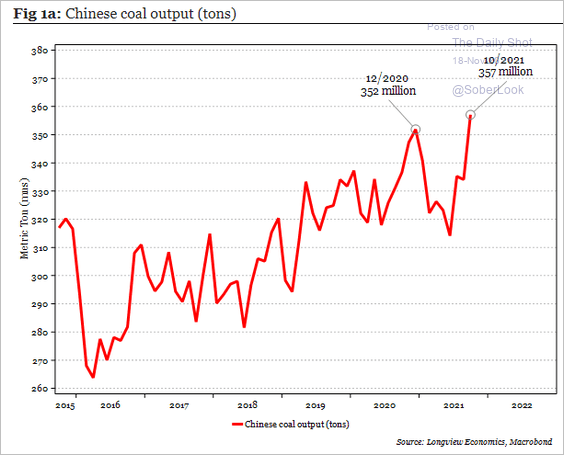 Chinese coal continues to correct at pace. Inventories are rising fast despite rising winter consumption as mine output booms: