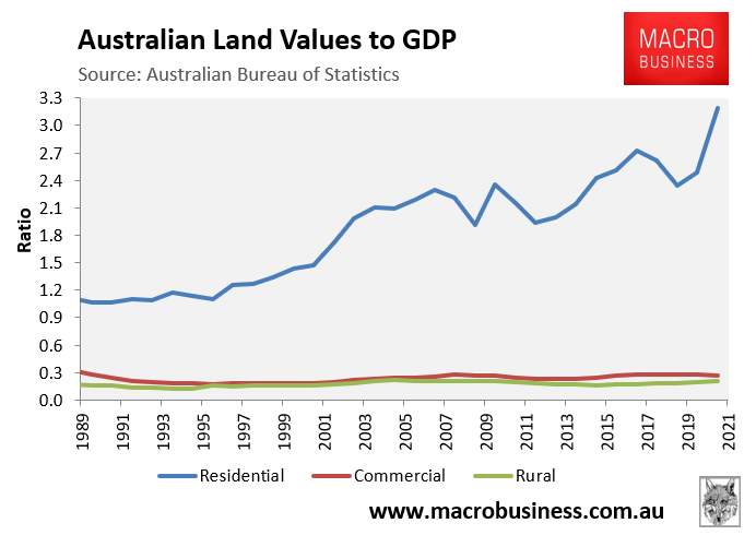 The next chart plots Australia’s aggregate land values by use relative to Australia’s gross domestic product (GDP) since 1989, which is as far back as the data goes: