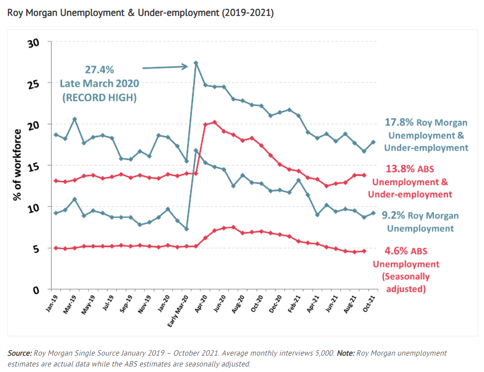The latest Roy Morgan employment series data shows 1.32 million Australians were unemployed in October, up 55,000 on September, for an unemployment rate of 9.2%, while under-employment was up 0.6% points to 8.6% (1.23 million).