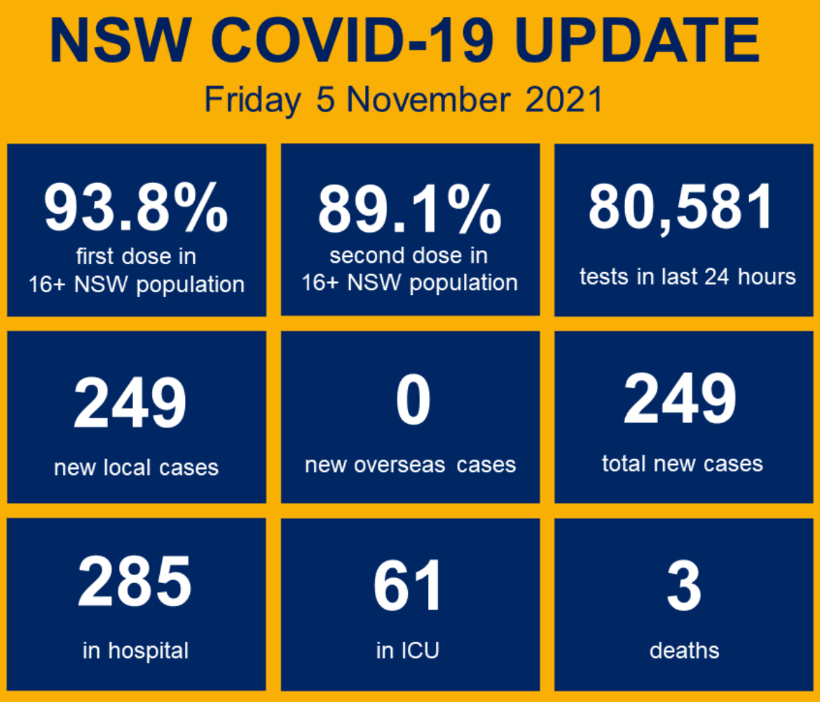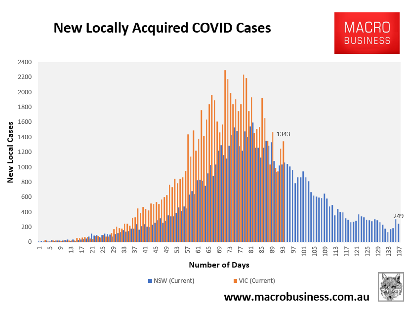 By comparison, NSW has recorded 249 locally acquired COVID cases and three deaths: