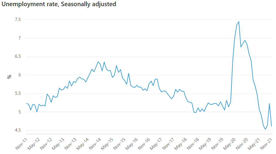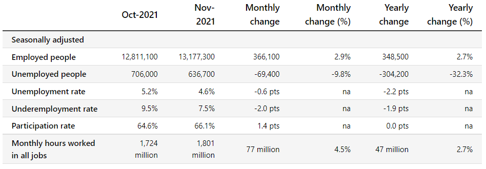 The ABS has released labour force estimates for November with jobs surging 366,100 and the unemployment rate diving 0.6% to 4.6%, despite a large 1.4% rise in the participation rate: