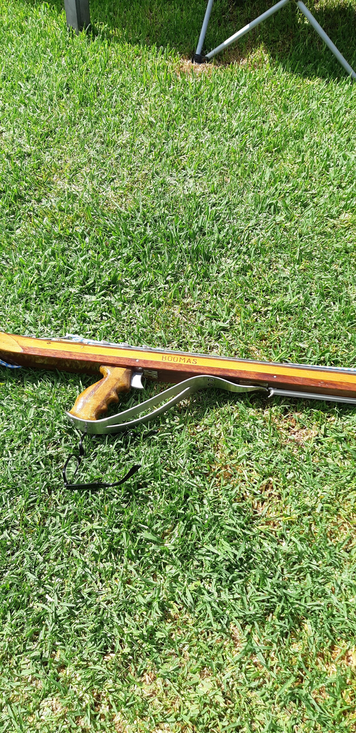 ‘Home made speargun 25 years ago. 4 x 3/4″ jelly rubbers. Winged spear for better loading. Vee rail for more accuracy. Internal mechanisms for mono filiment release. Hand grip custom fit to my hand. Detachable spearhead to stop big fish bending spear. Wood layered for more ridgity. 3/8″ spear for more inertia and strength Floatline attached, for fish collection. Monofiliament looped over spear to secure in released position.’