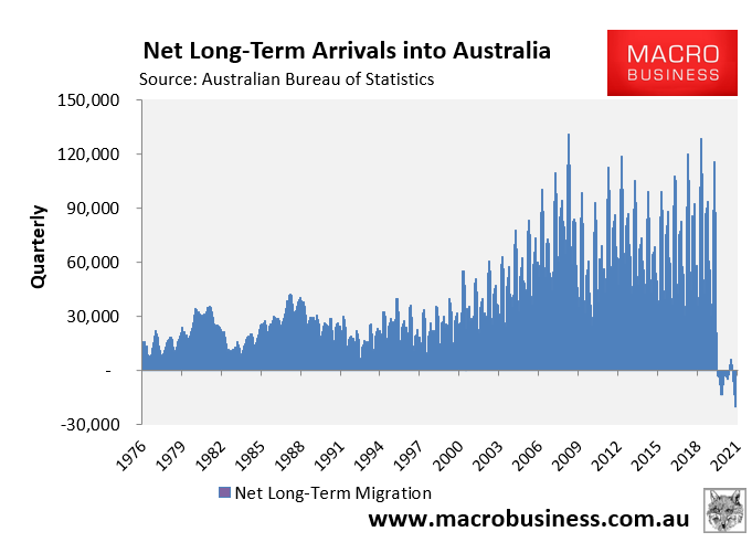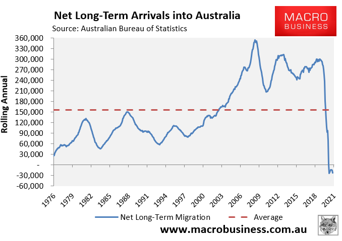Since the pandemic began in March 2020, there have been 40,750 net permanent & long-term departures, representing the first time that net arrivals have been negative since the series commenced in 1976: