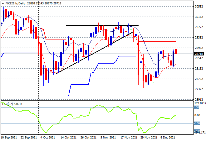 European markets all had nominally higher finishes with the FTSE the best up 1.2% while the German DAX managed a neat 1% finish higher at 15636 points. This was before Wall Street fell later in the session with futures indicating a pullback of at least half of those returns when markets re-open for the final session of the week tonight. Price is still unable to get clear of the former trailing ATR resistance level at around 15800 points so I’ll continue to watch the low moving average here which must firm as short term support, but notably daily momentum remains negative: