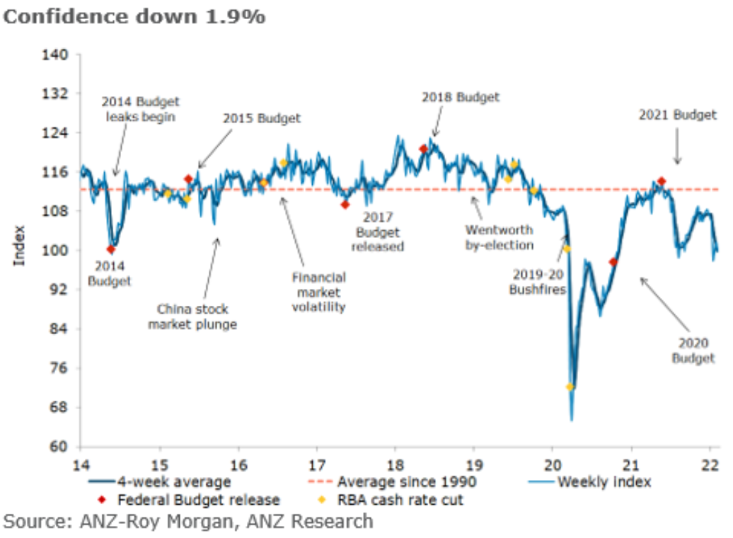 The ANZ-Roy Morgan consumer confidence index remains in the gutter after falling another 1.9%: