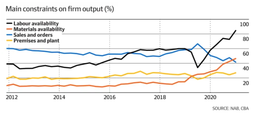 A record 85% of Australian businesses report staff shortages, according to the NAB quarterly business survey:
