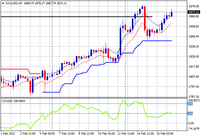 An uneasy session across Asia today as risk markets absorb the overnight news about Ukraine, the latest Fed minutes and the machinations in bond markets. The USD continued to slip against most of the major currencies although the Aussie dollar oscillated wildly on the latest unemployment print. Bitcoin failed to make good on its recent modest liftoff, while gold is holding on to its overnight gains at the $1870USD per ounce level, matching the previous near six month high: