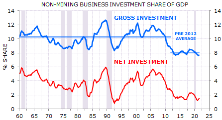 In short, prior to the pandemic trend growth in per capita GDP and per capita spending were running at 70 year lows; real wages were stagnant; and non-mining business investment had spent a decade at levels only seen before at recession nadirs.
