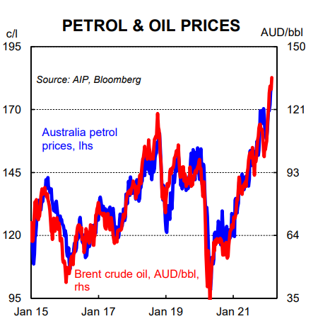 Our hard commodities strategist Vivek Dhar expects Brent oil to average ~$US110/bbl over the next six months (the peak in prices could be a lot higher than this). On an unchanged AUD/USD, an average Brent price of $US110/bbl over six months would see domestic petrol prices average ~$A1.95p/l. This would add a further 0.5ppts to headline inflation over the period and we have upwardly adjusted our forecast profile accordingly (we now expect headline inflation to reach 4.4%/yr at mid-2022).