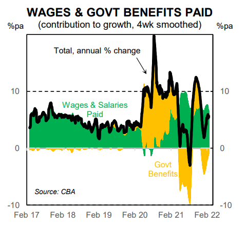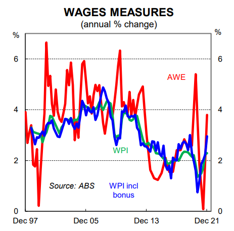 Wages data published last week indicated that wages pressures were intensifying towards the end of 2021. The 0.7% increase in the wage price index (WPI) over Q4 21 was the strongest quarterly increase in the WPI since March 2014. And according to the ABS, “the proportion of pay rises reported over the December quarter was higher than usually seen”.