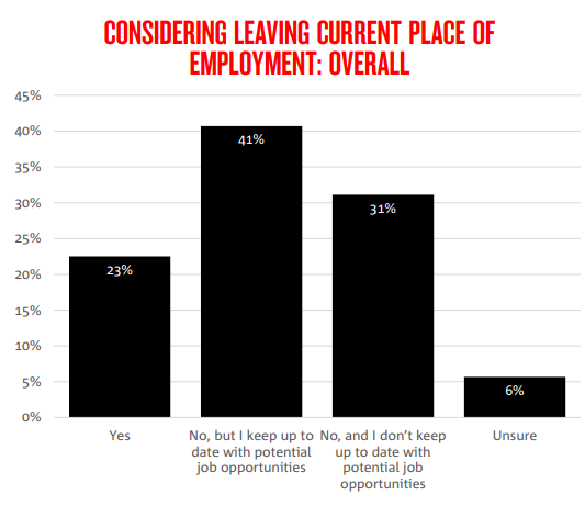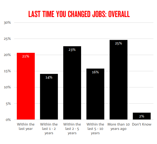 Just over 1 in 5 [21% of] Australians have changed jobs within the last year and almost 1 in 4 [23%] are considering leaving their current place of employment…