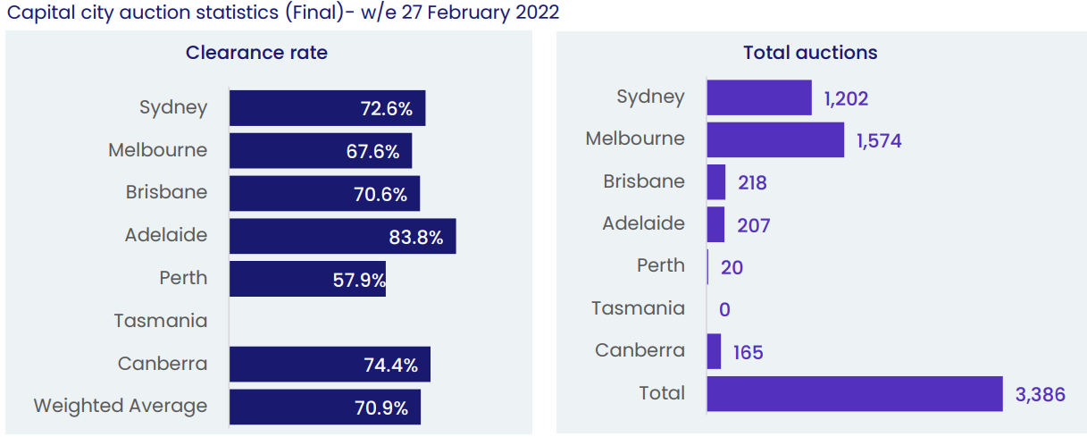 With 3,386 homes taken to auction, the final clearance rate came in at 70.9%, down from 74.3% the prior weekend: