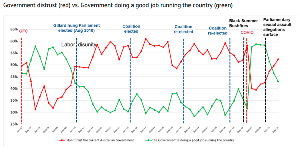 The extended lockdowns in Sydney, Melbourne and Canberra in the second half of 2021 along with the failure to procure enough vaccines and ‘Rapid Antigen Tests’ later in the year when the ‘Omicron variant’ emerged have seen distrust levels in government increase to record levels.