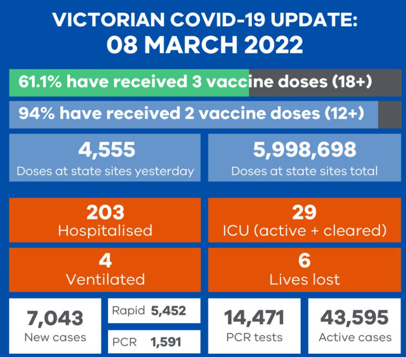 Victoria recorded 7,043 new COVID cases and six deaths: