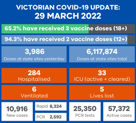 Victoria recorded 10,916 new cases and five deaths: