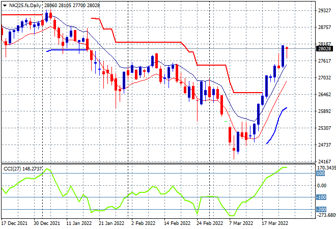 Japanese stock markets put in scratch sessions with the Nikkei 225 finishing up a handful of points to remain above the 28000 point level. Futures are indicating a flat start to the trading week even though Yen remains extremely weak, the messaging from overseas markets is not that clear. Price action however does indicate more upside potential given that weekly resistance at the 27500 point level has been cleared with the February highs taken out: