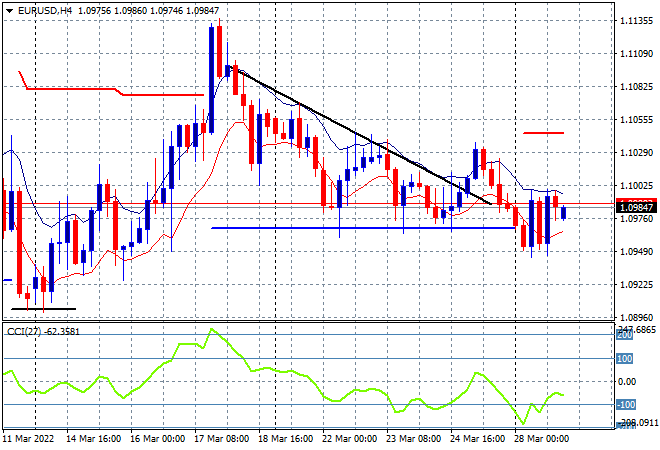 Currency markets saw no effective change to USD strength but it remains quite strong against Euro which continues to fail to make any headway. The union currency remains below the 1.10 handle with the four hourly chart continuing to show price anchored at ATR support. There remains the potential to fallback to the start of war position, as four hourly momentum remains negative while daily momentum is neutral at best: