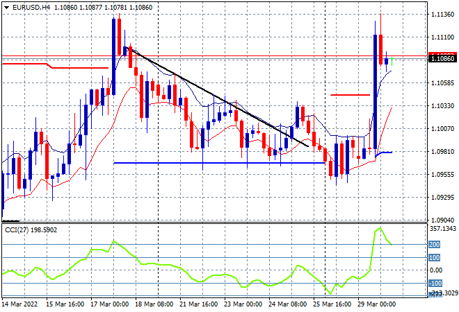 Currency markets saw a drop in USD strength mainly due to a big surge in Euro as the possibility of progress in peace talks between Ukraine and Russia took sentiment in the union currency much higher, lifting back to the previous weekly high at the 1.11 handle. This very fast reaction is likely overdone so watch for the high moving average on the four hourly chart that has to hold here to make this sustainable, or any bad news from the peace talks breaking down will send it swiftly back to previous weekly support around the 1.09 level: