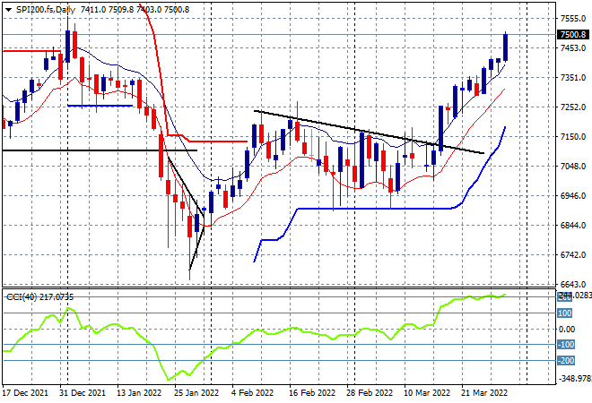 Japanese stock markets also rebounded with the Nikkei 225 closing more than 1% higher at 28252 points. Futures are indicating a strong start on the open despite a stronger Yen overnight as risk sentiment correlation increases. Price action and daily momentum readings overall indicate more upside potential given that weekly resistance at the 27500 point level has been cleared with the February highs taken out: