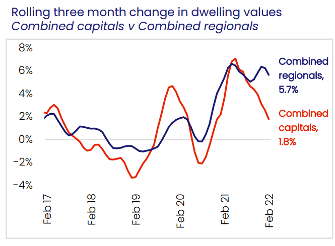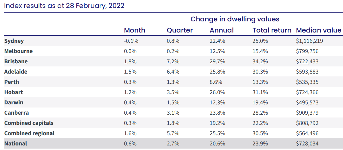 CoreLogic has released its full dwelling value results for February, which shows that dwelling values nationally grew by 0.6% over the month, by 2.7% over the quarter, and by 20.6% year-on-year: