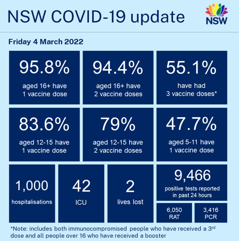 NSW has recorded another 9,466 new COVID cases and two deaths over the past 24 hours:
