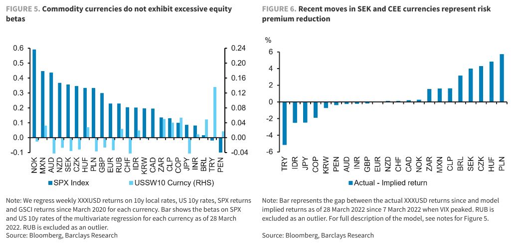Managing tactical risks. Rotating funders can help hedge commodity currency exposures, in the event of an adverse risk move. To identify which currency might be most exposed to an equity sell-off, we run a factor regression where dollar crosses are regressed against changes in local 10y rates, US 10y rates, SPX returns and GSCI returns. We find that the average beta of commodity currencies to equities is not materially different to that of the EUR. SEK and CEE currencies are direct hedges if there is a flare up in the Russia-Ukraine war. Within the commodity space, the beta to risk can be further reduced by tactically bringing down the exposure to MXN and NOK, in particular. AUD would also underperform substantially in a risk-off scenario where yields stay high or rise further.