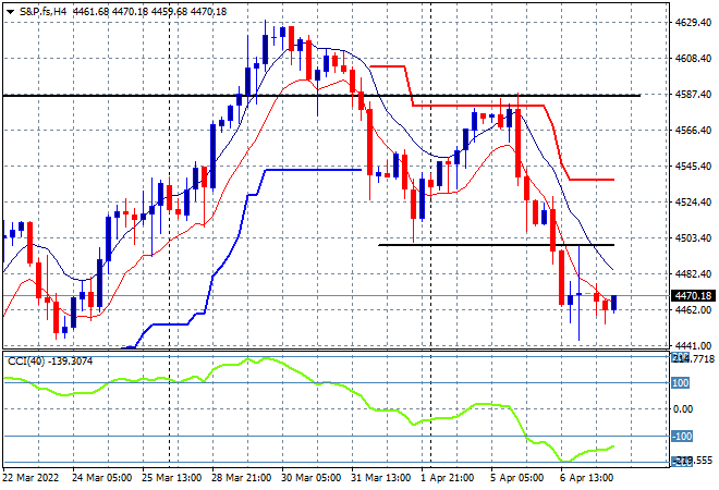Eurostoxx and Wall Street futures are somewhat sideways as we head into the London session, with the S&P500 four hourly chart holding fast at the 4470 point level, but this looks like going down another set of stairs with weekly support coming up very shortly as momentum remains oversold: