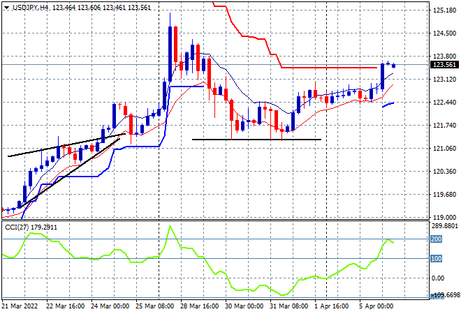 Gold was looking interesting, having defended price above the $1900USD per ounce level, but again did nothing last night to finish flat at the $1923USD per ounce level. Price is coming up against the downtrend from the mid March highs with momentum still basically neutral, with a close above the high moving average at the $1930 area required soon or this will rollover swiftly: