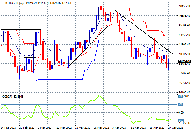 The USDJPY pair is coming back however, perhaps indicative of some oversold conditions on risk markets with a bounce back up through the 128 handle overnight. This might be the start of another consolidation after the too far, too fast early April trend blowout so watch for momentum to stabilise in the positive zone, if not quite overbought as we finish the trading week: