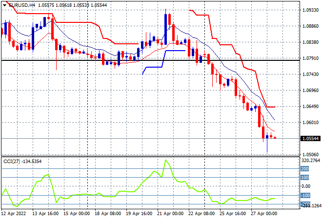 Currency markets remain stuck in a funk with the ever stronger USD pushing Euro and Pound Sterling to more new structural lows overnight. The union currency is seemingly losing a handle a session at the moment, falling below the 1.07 level to start the week and now well below the 1.06 level as it remains clearly oversold and ready for more downside although I still expect a short term swing bounce before a return to the long term trend down to parity: