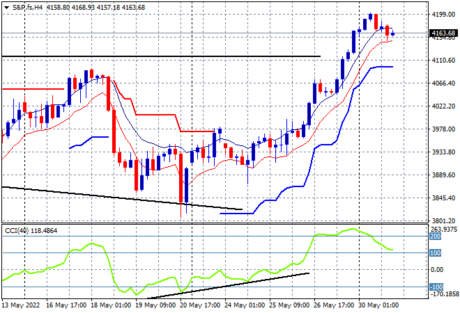 Eurostoxx and Wall Street futures are steady as we head into the European open as traders get ready for the Americans to rejoin the party. The S&P500 four hourly futures chart shows price heavily overextended after the Friday night surge through the 4100 point level with short term momentum retracing from a very overextended position, so a flat start is likely on the open tonight: