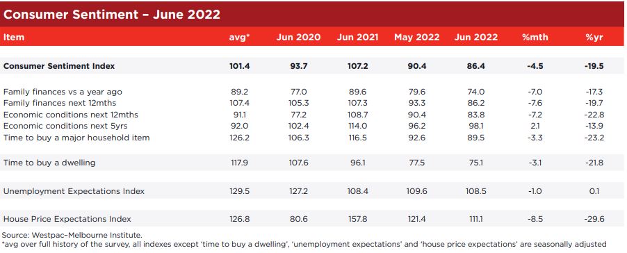 The Westpac Melbourne Institute Consumer Sentiment fell 4.4% in June from 90.4 in May to 86.4 in June.