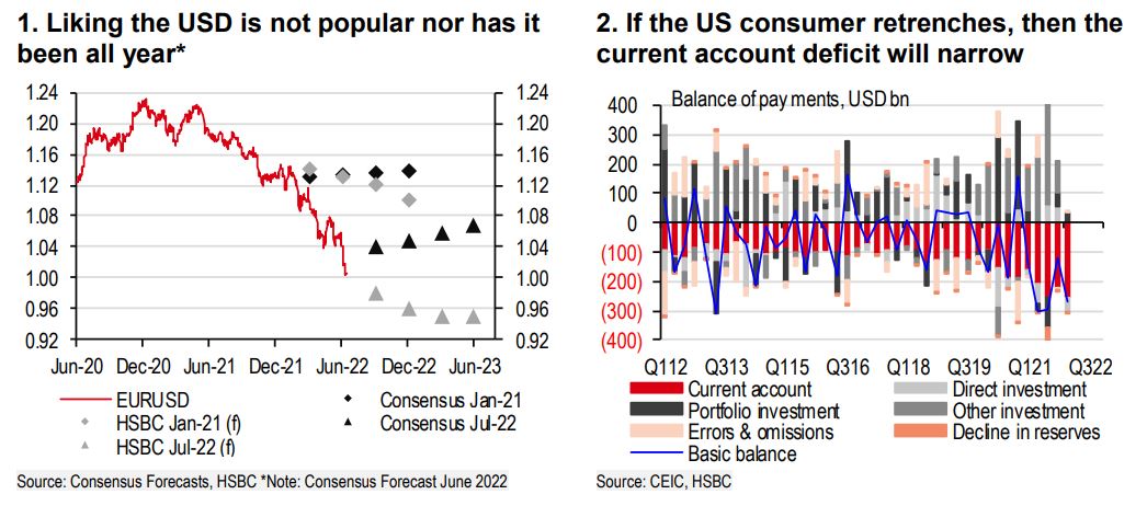 The dollar’s bull run started close to a year ago and is showing little sign of coming to an end, as we discussed in the previous edition of the Currency Outlook (see Currency Outlook: The pause that refreshes, 9 June 2022). In fact, we believe it has more room to run and we have upgraded our USD forecasts further, especially versus European currencies. Our belief in the strong USD has been in place for nearly a year given the hawkish Fed and slowing global growth but remains non-consensus. Despite us adopting a strong USD stance nearly a year ago, we have not been bullish enough. What stands out, however, is the consensus looking for the USD to fall, as it has done so consistently. A prime example is EUR-USD which forecasters still see rising in the year ahead (Chart 1). There are many arguments put forward for why the USD will decline but these continue to be misjudged.