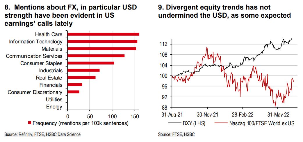 Despite the flow support to the EUR and other currencies looking less supportive, there is an ongoing discussion how the USD’s resilience is creating problems. The impact on US earnings’ is noticeable, especially for US health and technology companies (Chart 8, see Data Matters: The circle of strife, 5 July 2022). This probably helps to explain why foreign demand for US equities slowed. The latest US balance of payments data show that through Q4 2021 to end Q1 2022 foreigners sold over USD400bn of US equities. This is an eye-watering amount. One would think that this would have dented the USD but as we know, this did not happen. The weakness of US growth equities relative to other equity market and the USD has not been a strong relationship (Chart 9). An explanation comes down to foreigners’ demand for US debt being a potent offsetting factor, purchasing nearly USD600bn in the same period.