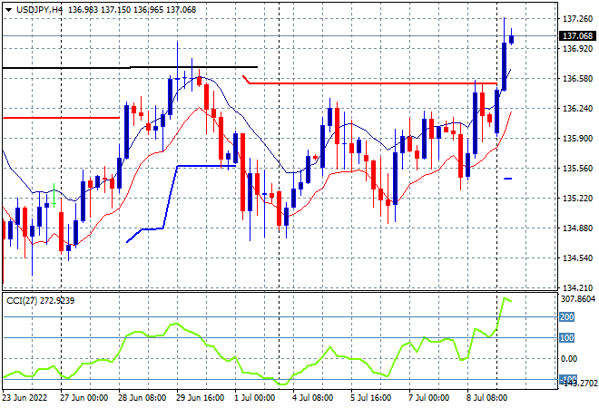 Mainland Chinese share markets started lower at the open and have continued to retrace sharply going into the close with the Shanghai Composite about to close 1.6% lower at 3302 points while the Hang Seng Index is slumping even faster, down 3% to 21048 points. Japanese stock markets however have bounced back the hardest, with the Nikkei 225 index closing 1.5% higher at 26855 points while the USDJPY pair has broken out to a new weekly high above the 137 handle in a strong surge this afternoon: