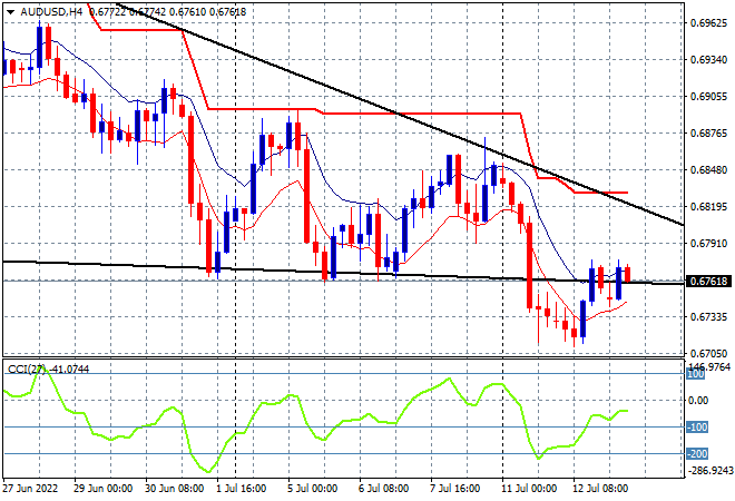 Asian share markets are trying to stabilise amid the risk off mood on overnight markets as traders position for tonight’s all important US inflation print. In fact the USD is losing ground slightly against all the majors in anticipation of a possibly low print, although Euro remains at parity while the Australian dollar has put in a mild bounce but is still depressed at the 67 cent level. Oil prices are also under pressure following last night’s big selloff, with Brent crude still hovering below the $100USD per barrel level, while gold is slipping further downwards, as it makes another new daily low at the $1724USD per ounce level: