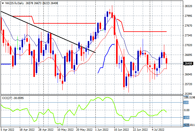 Looking at share markets in Asia from yesterday’s session, where Chinese share markets looked shaky at the open before retracing sharply going into the close with the Shanghai Composite finishing down 0.9% to 3281 points while the Hang Seng Index was off by 1.4%, closing at 20844 points. The daily chart continues to prove the 22000 point level as considerable resistance that has kept this market in check for sometime now with this steep rollover likely to see price retrace back to the early June lows around the 20600 point area next, so watch daily momentum readings that are now oversold: