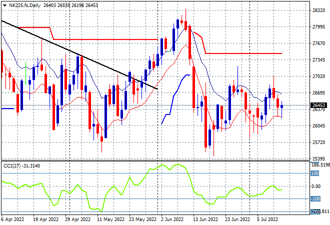 Looking at share markets in Asia from yesterday’s session, where Chinese share markets were somewhat mixed with the Shanghai Composite closing up just 2 points to 3284 while the Hang Seng Index nearly put in a scratch session before closing 0.2% lower at 20797 points. The daily chart continues to firm the 22000 point level as considerable resistance that still keeps this market locked in place as price retraces back to the early June lows around the 20600 point area. Watch daily momentum readings that are now oversold carefully for signs of a follow through below ATR support at 20000 points proper: