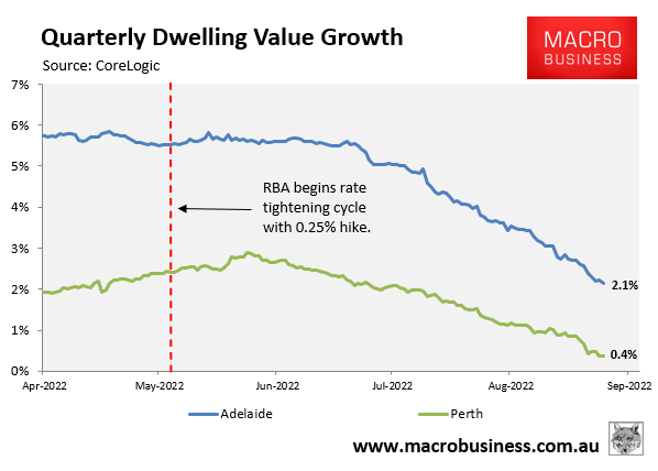 While quarterly growth remains positive across Adelaide (+2.1%) and Perth (+0.4%), the rate of growth has slowed significantly. This reflects the recent declines in response to the Reserve Bank of Australia’s (RBA) aggressive rate hikes: