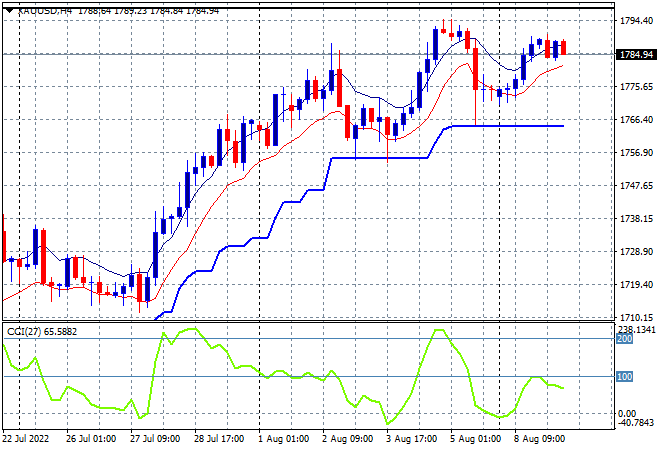 Asian stocks are generally directionless as the region picks up mixed cues from Wall Street overnight with the stronger USD and more hawkish Fed keeping risk sentiment at bay. The USD has pushed local currencies around again although the Australian dollar has dropped on today’s consumer sentiment print. Meanwhile oil prices are just holding on to their recent daily lows after recently falling below key support levels, with Brent crude hovering at the $96USD per barrel level, while gold is stable and holding above short term support at the $1780USD per ounce level: