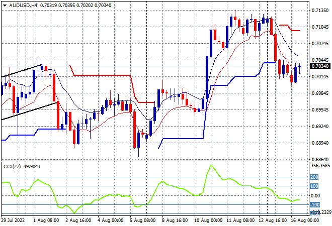 Another relatively mixed session for Asian stocks with Chinese bourses unstable with only the ASX200 lifting substantially as the Australian dollar continues to falter as it hovers at the 70 cent level while Euro flops around after a very poor start to the week. Meanwhile oil prices are also slipping, with Brent crude retracing further well below the $100USD per barrel level, while gold is again proving frustrating as it holds on to its poor Monday morning start well below the $1800USD per ounce level: